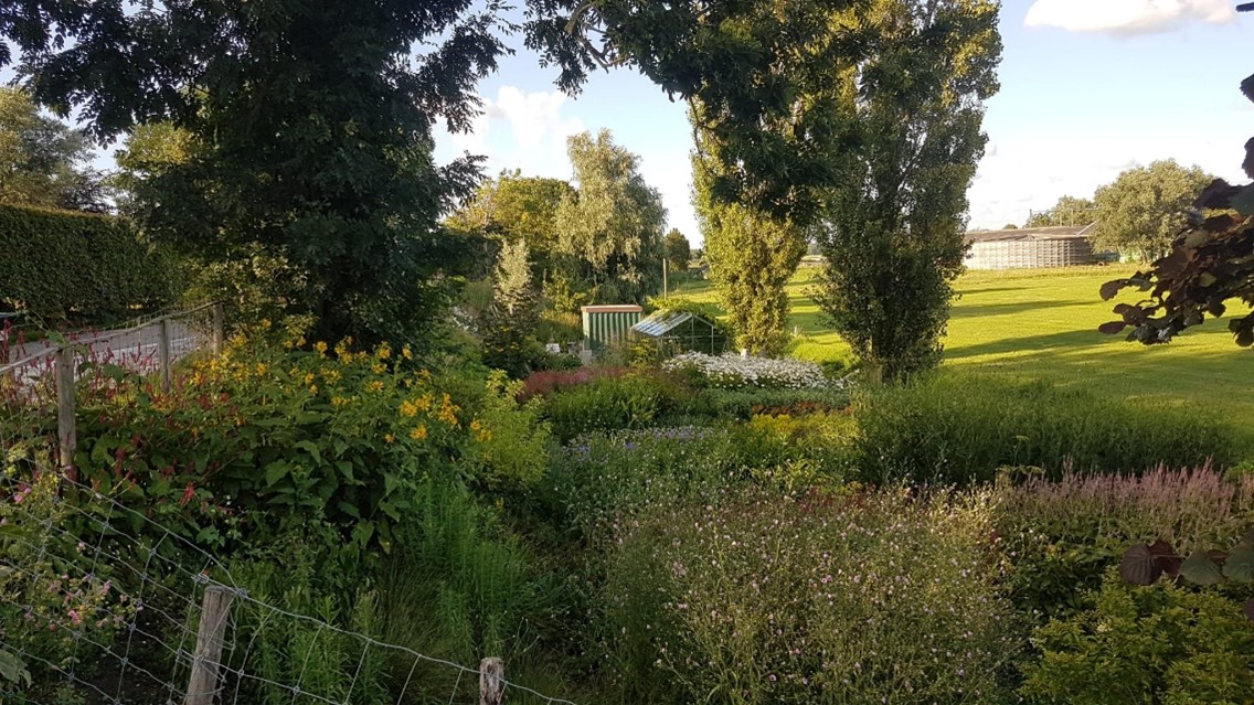 Er zijn een zon- en schaduwterras, diverse hoogteverschillen, zoals een verdiept boomgaardje (met een geheel eigen sfeer) en zelfs zgn. ‘geitenpaadjes’ langs de dijk.