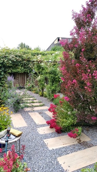 De passie voor tuinieren is bij Marcel al vroeg ontstaan, want als kind hield hij ervan om heerlijk in de tuin te rommelen. In de loop der tijd hielp hij ook vriendinnen met hun tuin en zo kwam er steeds meer interesse in tuinieren en het vinden van bijzondere planten en struiken. Na een forse verbouwing en uitbreiding van de tuin is hij in 2009 bij zijn partner komen wonen. Tevens nog even een sloot gedempt en zo begon het echte werk. Waar water verdween, kwam weer water terug………een heerlijke vijver. Daarna een tuinhuis geplaatst en paden van grind aangelegd. Stukje voor stukje dingen uitgeprobeerd: grassen geplaatst en later toch weer weggehaald. Een plant komt en een ander verhuist……Zo ook met de verzameling potten met leuke planten. Niets ligt vast en alles is mogelijk. Zonder schroom gaat Marcel te werk en weet veel mooie kleuren met elkaar te combineren. Favoriet is de Fitex, een Persische roos en de lievelingsstruik is Lagerstroemia indica turenne. De stijl van deze tuin is duidelijk Engels, maar niet formeel en “vooral warm en gezellig,” zegt Marcel. Nieuwe plannen? “In april samen naar kwekerijen gaan en bijzondere planten kopen,” zegt Marcel. Samen genieten ze intens van de tuin, maar waar Marcel het werk meteen ziet, loopt Richard er gewoon lekker langs. Dit is geen showtuin, maar een tuin die leeft en groeit uit liefde, ervaring en nieuwsgierigheid. |