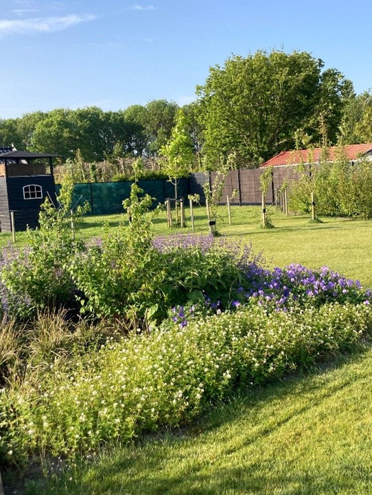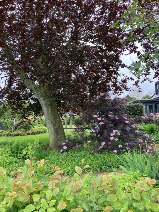 De tuin is nu 4 jaar oud en is ontworpen rond twee 50 jaar oude rode beuken. Er is naast dat er gras is ingezaaid, een variatie aan planten gepoot. Daardoor hebben we het grootste gedeelte van het jaar bloei in de tuin. Dwars door de tuin ligt een houten vlonder, tevens zijn er kiezelpaden door de tuin aangelegd.