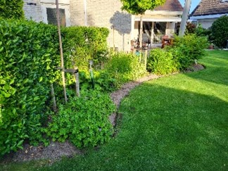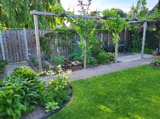 De tuin is ca. 250m2 groot en zowel voor- als achtertuin zijn aangelegd met ronde vormen. Er staan veel insecten- en vogel-vriendelijke planten in. Aan 3 kanten is een zitplek gecreëerd, zodat je steeds een ander zicht op de tuin hebt. Ook is er een kleine moestuin met wat fruitplanten.